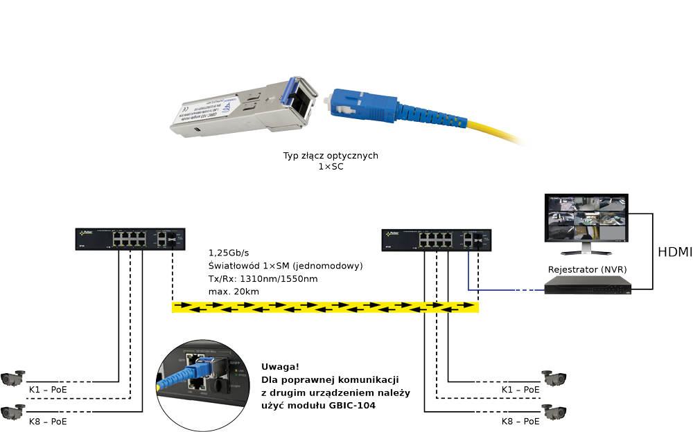 Správna komunikácia s inými zariadeniami si vyžaduje použitie modulu GBIC-103