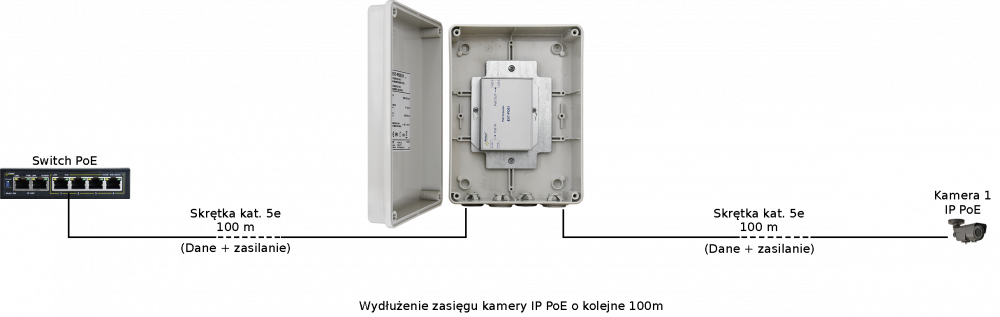 Použitie: Zvyšuje dosah výkonu Ethernet a PoE o 100 metrov.