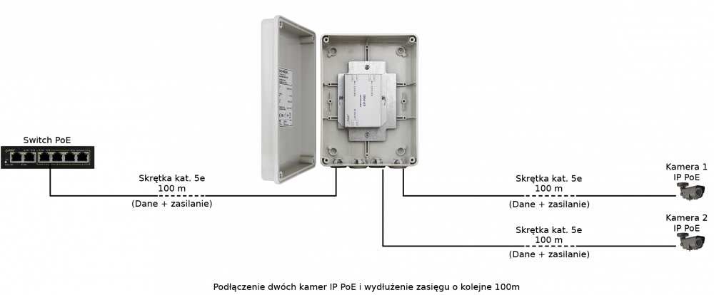 Použitie: Zvyšuje dosah výkonu Ethernet a PoE o 100 metrov. Umožňuje pripojenie dvoch kamier IP-PoE pomocou jediného kábla.