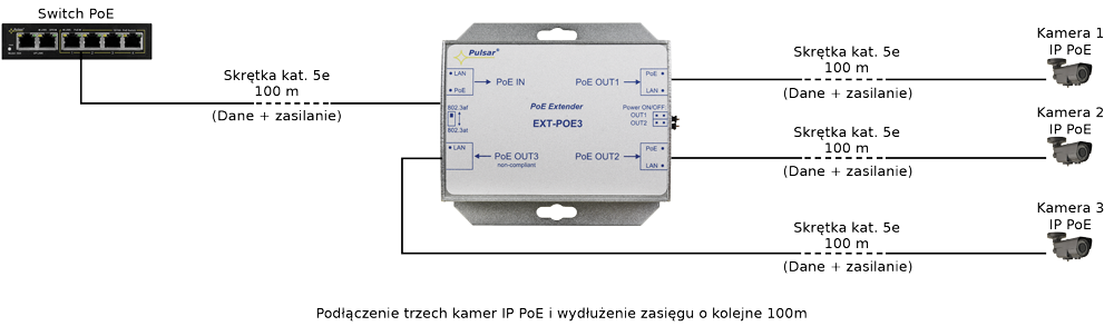 Použitie: Increases Ethernet and PoE power range by 100 meters. Allows connecting three IP-PoE cameras using a single cable.