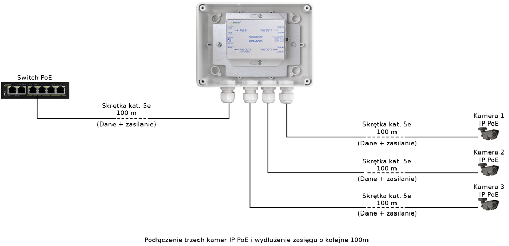 Použitie: Increases Ethernet and PoE power range by 100 meters. Allows connecting three IP-PoE cameras using a single cable.
