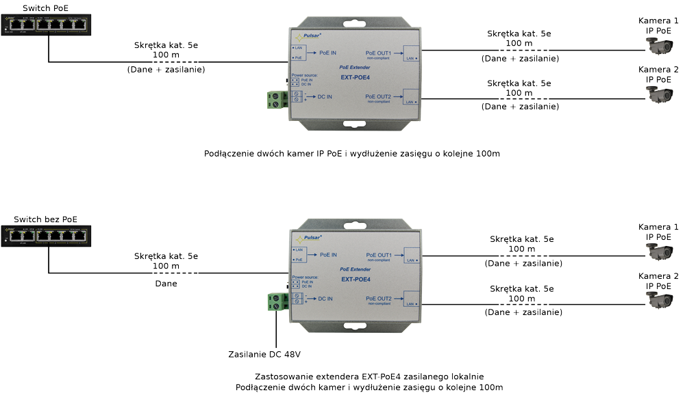 Použitie: increases Ethernet and PoE power range by 100 meters