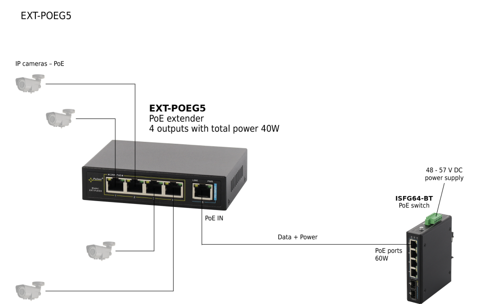 PoE extender, 1x RJ-45 vstup, 4x PoE výstup, LAN 10/100/1000Mbps, vstup PoE 802.3af/at/bt, výstupy 1 – 4 PoE 802.3af/at, max. celkom 40W (PoE IN)/60W (DC IN), predĺženie o max. 100m UTP cat5/5e, vlastná spotreba