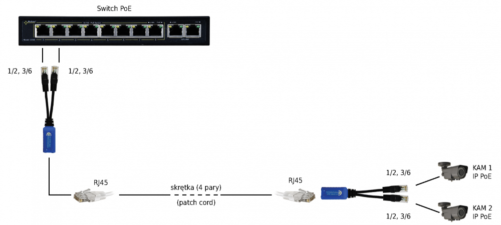 Použitie: Splitter P-POE2 enables transfer of power and data to two IP PoE cameras or other devices, that are compliant with this standard, using UTP twisted pair cable cat. 5e.