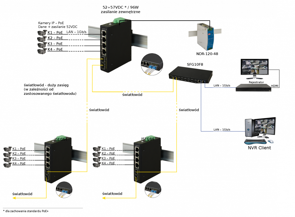 Použitie: ISFG64 je 6-portový SWITCH PoE určený na napájanie IP kamier pracujúcich v štandarde 802.3af /. Prepínač na portoch 1 až 4 má funkciu automatickej detekcie zariadení napájaných podľa štandardu PoE / PoE +.