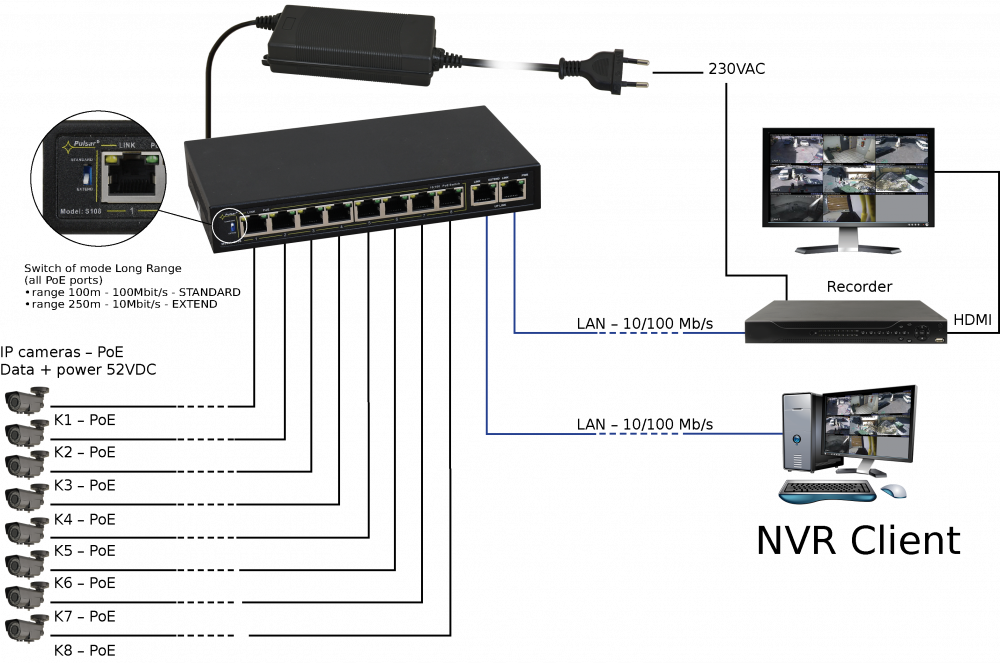 Použitie: S108-90W je 10-portový switch PoE určený na napájanie kamier IP pracujúcich v štandarde IEEE 802.3af/at. Switch má na portoch od 1 do 8 funkciu automatickej detekcie zariadení napájaných v štandarde PoE/PoE+.