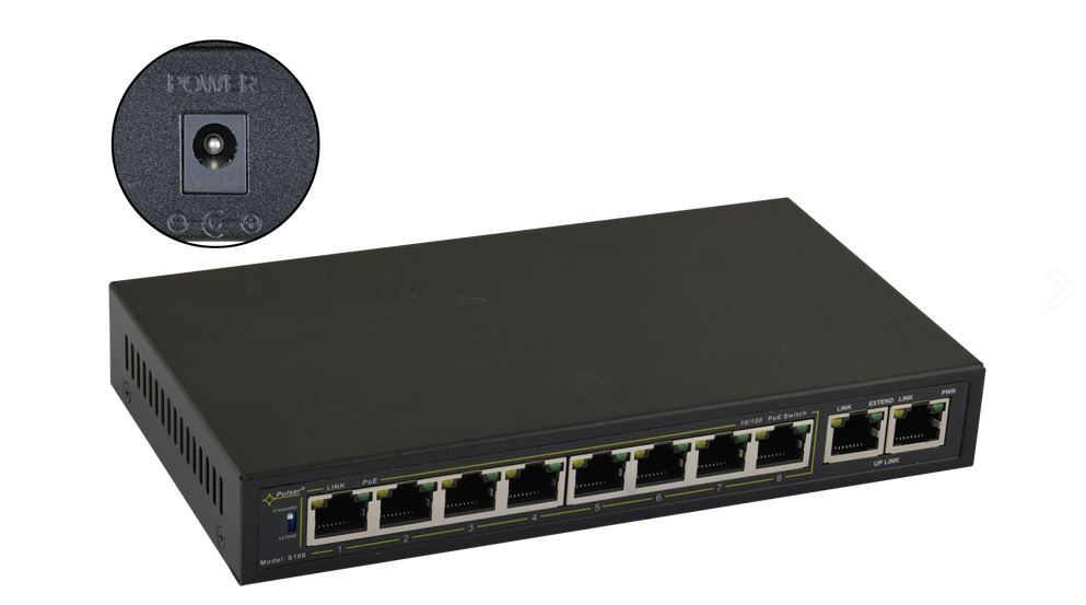 Použitie S108WP je 10-portový switch PoE určený na napájanie kamier IP pracujúcich v štandarde IEEE 802.3af/at. Switch má na portoch od 1 do 8 funkciu automatickej detekcie zariadení napájaných v štandarde PoE/PoE+.