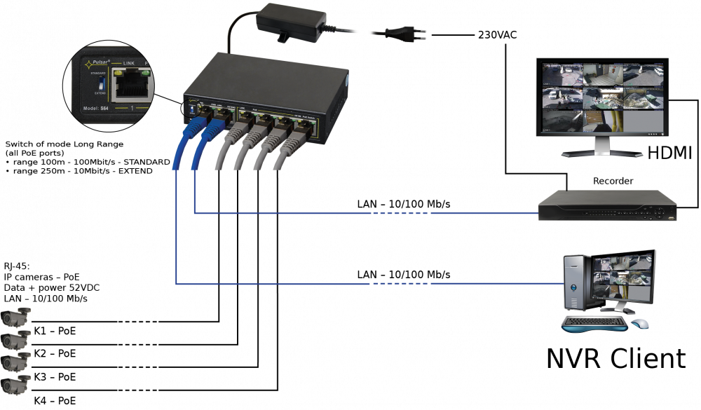 Použitie: S64 je 6-portový switch PoE určený na napájanie kamier IP pracujúcich v štandarde IEEE 802.3af/at. Switch má na portoch od 1 do 4 funkciu automatickej detekcie zariadení napájaných v štandarde PoE/PoE+.