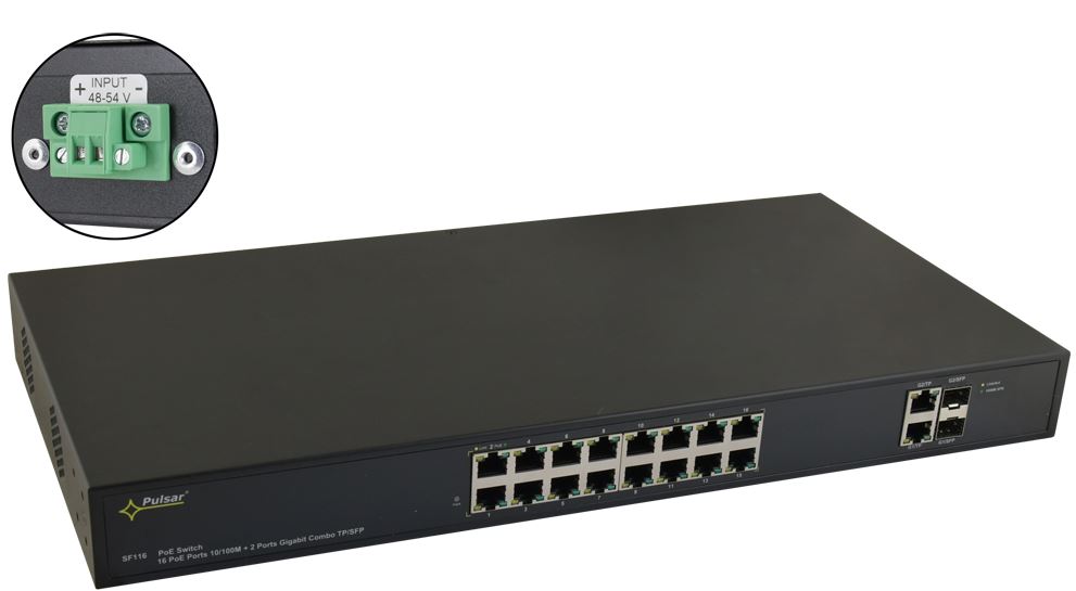 SF116WP je 16-portový switch PoE určený na napájanie kamier IP pracujúcich v štandarde IEEE 802.3af/at. Switch má na portoch od 1 do 16 funkciu automatickej detekcie zariadení napájaných v štandarde PoE/PoE+.