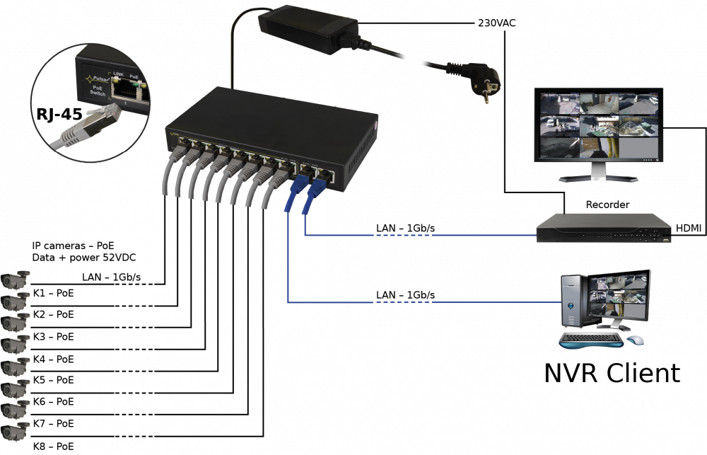 Použitie: SG108 je 10-portový switch PoE určený na napájanie kamier IP pracujúcich v štandarde IEEE 802.3af/at. Switch má na portoch od 1 do 8 funkciu automatickej detekcie zariadení napájaných v štandarde PoE/PoE+.