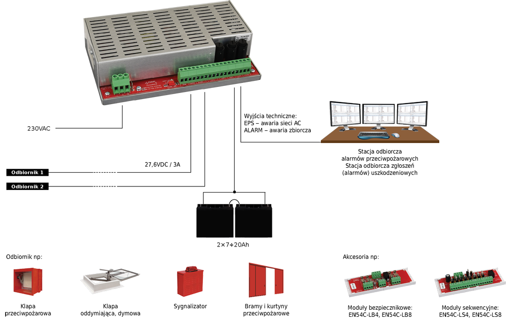 – To be able to install module of PSU in the fire alarm system, it must be placed in enclosure of appropriate design and make complementary examinations to achieve certificate EN54-4 A1 A2 or PN-EN12101-10 AC in accredited institution